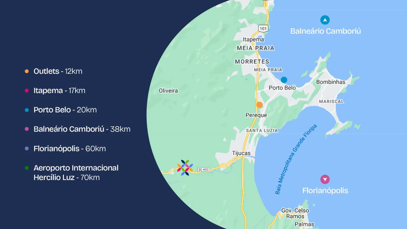 1º Bairro Cidade de Tijucas/SC (conforme material do empreendimento)+100.000 m² destinados ao lazer e áreas verdes (conforme catálogo)+20 opções de lazer (conforme catálogo)Lago com +20 mil m² e trapiche (conforme catálogo)Aprox. 10 min do Centro de Tijucas/SC (conforme catálogo)
